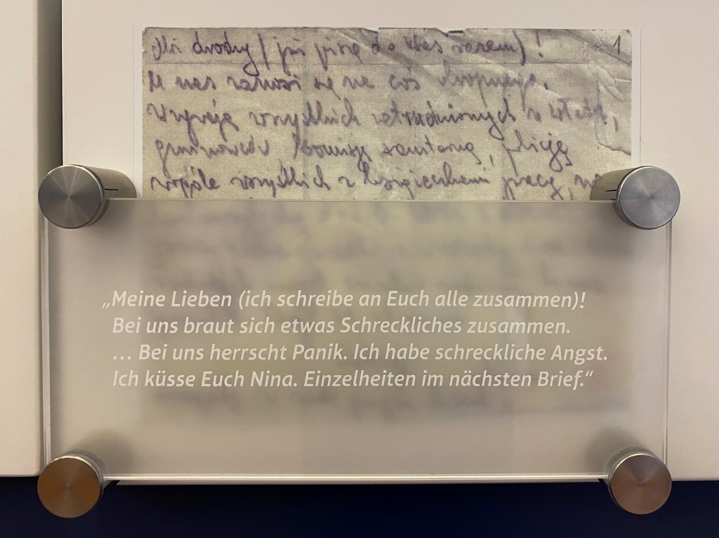 „Meine Lieben (ich schreibe an Euch alle zusammen)! Bei uns braut sich etwas Schreckliches zusammen. […] Bei uns herrscht Panik. Ich habe schreckliche Angst. Ich küsse Euch Nina. Einzelheiten im nächsten Brief.“