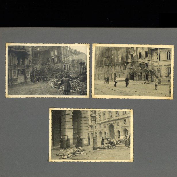 Sinnbilder der antijüdischen Vernichtungspolitik werden durch Aufnahmen von brennenden Synagogen und zerstörten jüdischen Geschäften Teil des Fotoalbums. Jüdinnen*Juden werden durch Bildkomposition und Zusatztexte als primitiv und bedrohlich repräsentiert – was einmal mehr den Versuch des Fotografen markiert, sich von einer vermeintlichen Andersartigkeit abzugrenzen und sich als überlegen zu positionieren. Ein Foto, auf dem jüdische Menschen zu sehen sind, die beschlagnahmtes Eigentum zum Quartier der Polizisten tragen, ist mit dem zynischen Satz „Juden bringen ihre Gastgeschenke!“ unterschrieben. Diese Beispiele verdeutlichen in eindrücklicher Weise die Perspektive des Erstellers auf das eigene Handeln. Aus heutiger Sicht irritiert das Verhältnis von Kriegsgewalt und Normalität bzw. Alltag, das auf den Seiten des Fotoalbums wie selbstverständlich zusammenkommt.