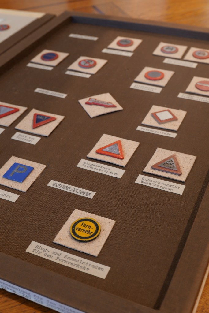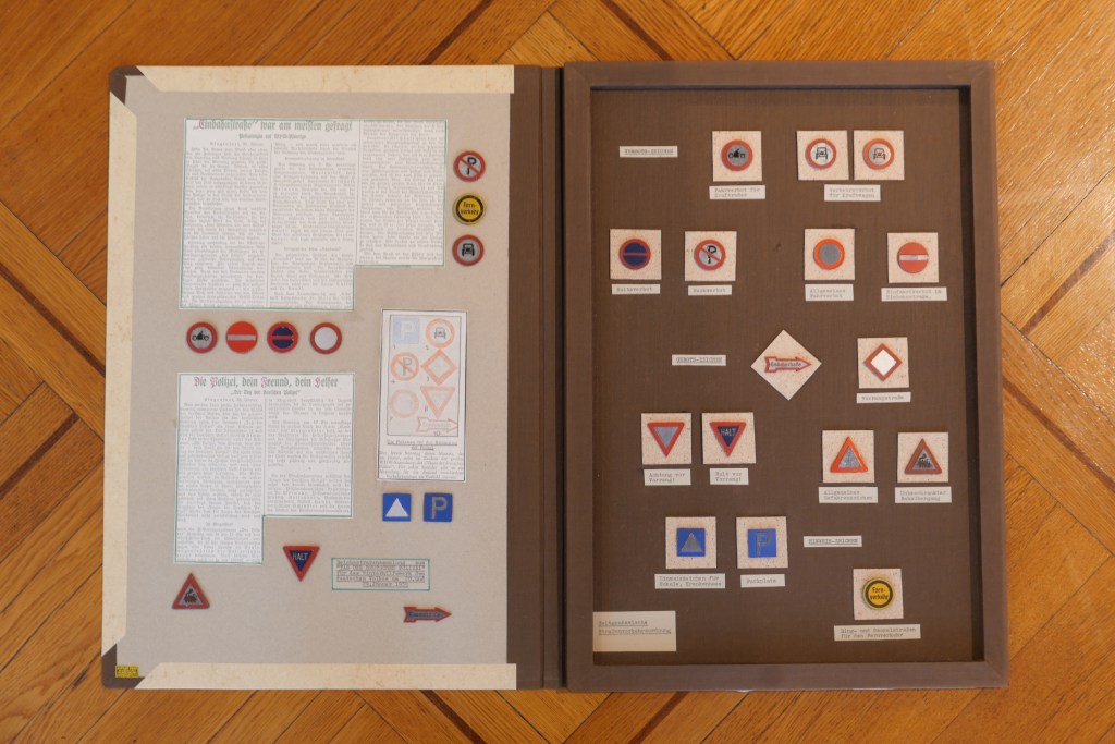 Welche Ausmaße diese Sammelleidenschaft annehmen konnte, zeigt ein historischer Zeitungsartikel, der in den Karton eingeklebt wurde: „Die Verkehrsabzeichen, die zu mancherlei Witzen Anlaß gaben, fanden reißenden Absatz – und manch einer wandelte als lebende Verkehrsschule durch die Straßen der Richtung des Einbahnpfeiles nach.“ Wahrscheinlich sind die Abzeichen als vermeintlich unpolitisches Material aus der NS-Zeit nach dem Krieg für den Verkehrsunterricht im Setzkarton angebracht worden. Dass solche Abzeichensammlungen über Jahrzehnte hinweg aufgehoben wurden, verrät, welchen individuellen Wert die Menschen ihnen beimaßen. Ähnliches belegen die in unserer Sammlung zahlreich vorliegenden Sammelalben mit Zigarettenbildchen, etwa von Hitler, aber auch von Olympia 1936 oder dem Aufstieg der NSDAP: Das mühsame Sammeln steigerte offensichtlich den individuell zugemessenen Wert. Sogar nach dem Krieg wurden sie aufgehoben, bevor sie ihren Weg in die Sammlung der Villa ten Hompel fanden. Dabei waren sie massenweise produziert und verbreitet worden: Zwischen 1936 und 1943 waren 2,39 Millionen des Albums „Adolf Hitler – Bilder aus dem Leben eines Führers“ im Umlauf.