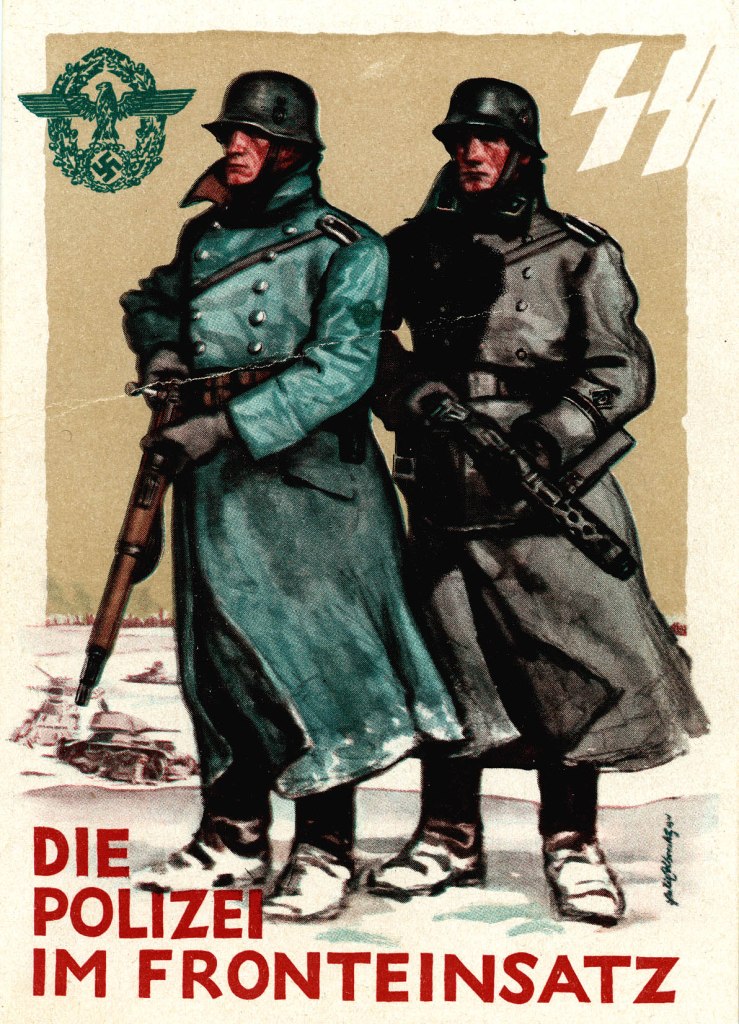 Auf der Vorderseite der Postkarte ist eine Kriegsmalerei zu sehen. Hier stehen zwei Männer mit Stahlhelmen und Gewehren, der linke in grüner, der rechte in grauer Uniform, in einer verschneiten Landschaft. Versehen ist das Bild mit dem Schriftzug „Die Polizei im Fronteinsatz“. Die Rückseite spezifiziert es als „Streife der Ordnungspolizei und der Sicherheitspolizei im Osten“. Die Botschaft ist deutlich: Die Polizei spielt so wie die Wehrmacht eine Rolle im Zweiten Weltkrieg und die an Propagandabilder der Wehrmacht angelehnte Darstellung stilisiert auch die Polizisten zu Helden.