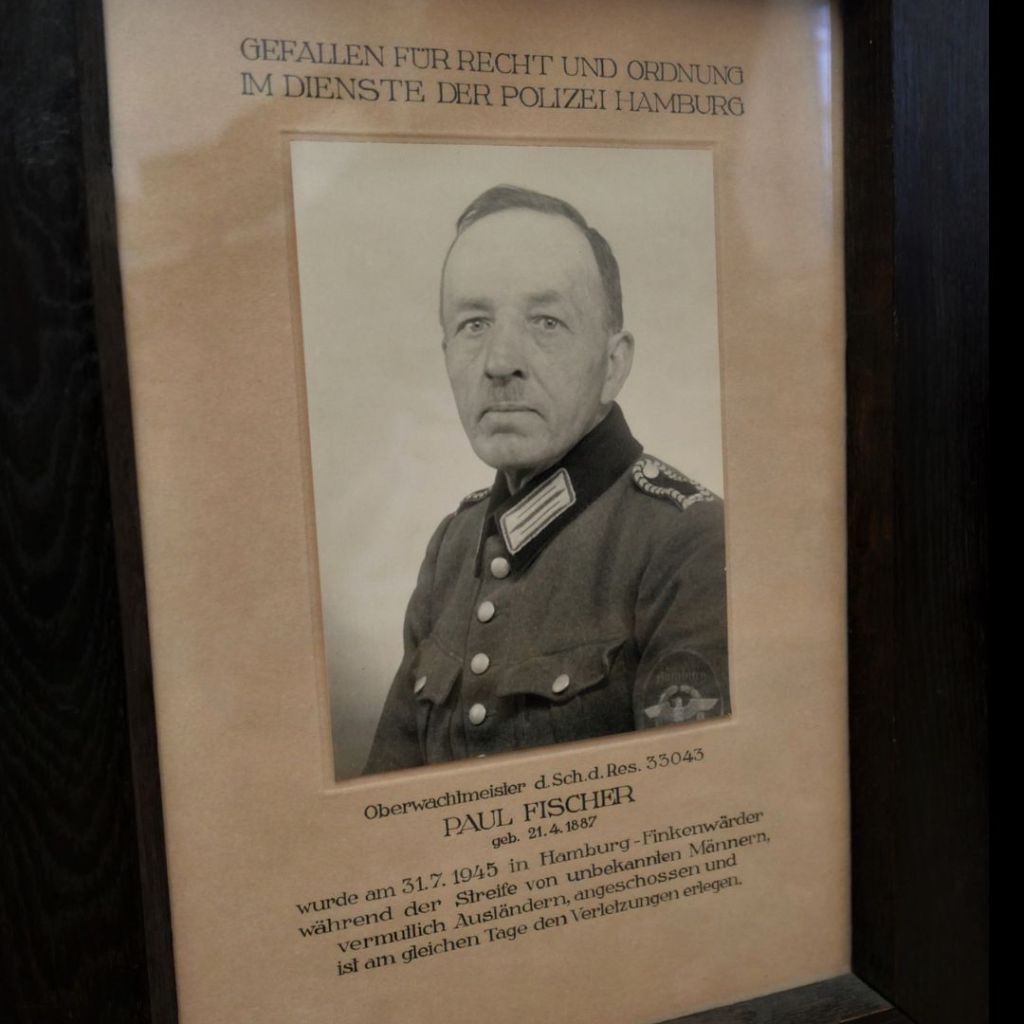 Warum und von wem wurde der Polizist Paul Fischer in Hamburg kurz nach Kriegsende erschossen? Beim Fundstück des Monats Januar handelt es sich um ein Andenken an Paul Fischer (1887–1945), der zuletzt als Oberwachtmeister in Hamburg tätig war. Über die Urheberschaft des Gedenkbildes kann nur spekuliert werden. Die förmliche Bildunterschrift legt ein institutionelles Gedenken nahe, sie würdigt Fischers Leistungen „für Recht und Ordnung“.