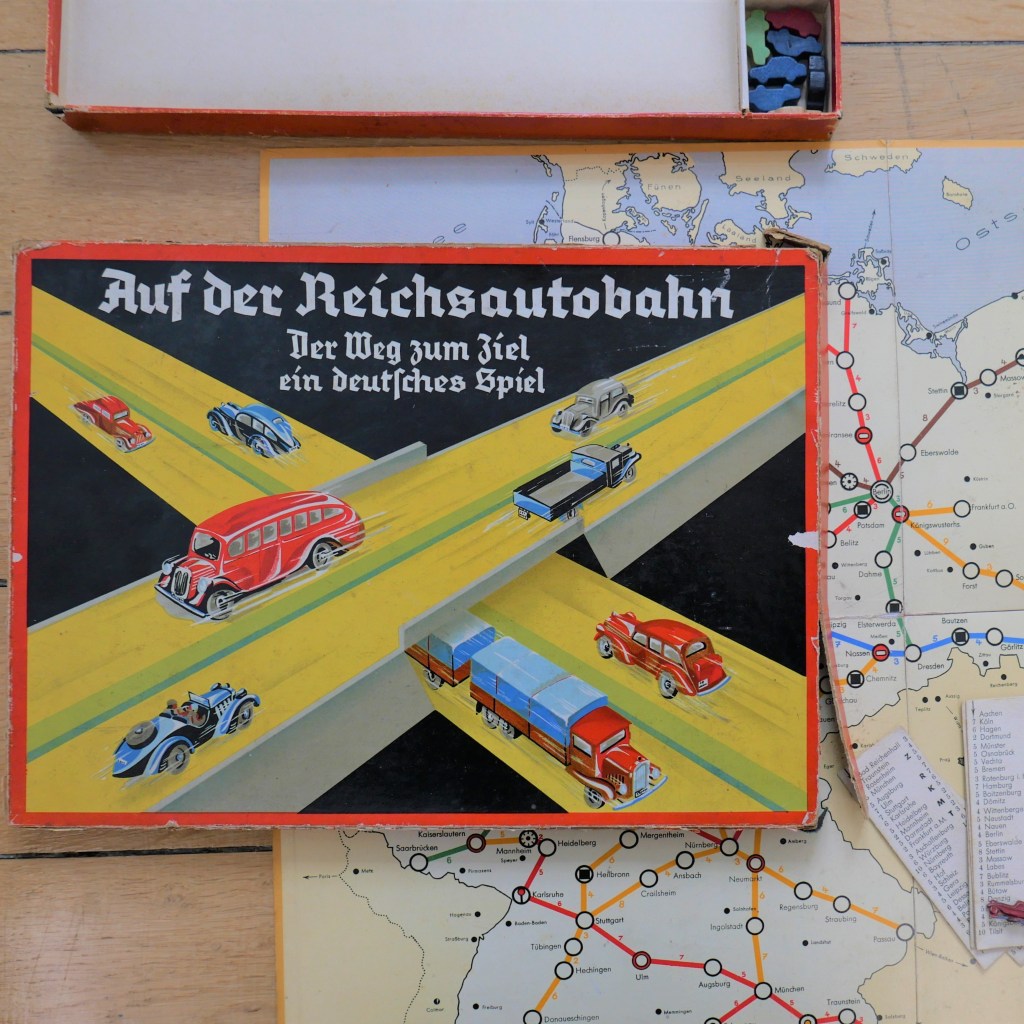 Die in der Sammlung der Villa ten Hompel überlieferte Ausgabe spiegelt die territorialen Verhältnisse der frühen 1930er Jahre wider. Nach Beginn des Zweiten Weltkriegs erschien 1940 eine Neuauflage mit angepasstem Titel: „Auf der Reichsautobahn durch Großdeutschland“. Der Spielplan war nun u. a. um das „Protektorat Böhmen und Mähren“ auf tschechoslowakischem Gebiet sowie das „Generalgouvernement“ auf polnischem Gebiet ergänzt. Es dauerte also nicht lange, bis die nationalsozialistische Besatzungspolitik zu Propagandazwecken Eingang in kommerzielle Medien fand. Neben Brettspielen wurden unzählige Bildbände, Filme, Postkarten und Plakate auf den Markt gebracht, die den Autobahnbau als Symbol des Fortschritts, der Arbeitsbeschaffung und des Wohlstands propagierten.